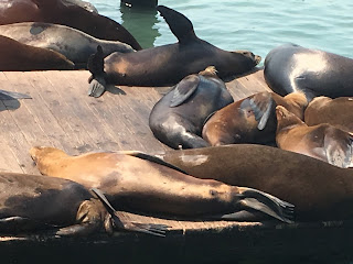 We took the ferry back and headed over to pier 39 to see the sea lions. There are a dozen or so little docks where they lay playing, fighting, tanning, sleeping. Some are apart from the others and most are laying on top of each other. They are like the pitbulls of sea mammals, with no boundaries and they must be on top of each other. :)